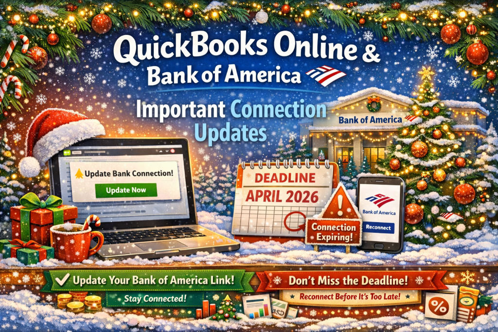 Bank of America is updating bank account connections in QuickBooks Online.  All current clients with an active Bank of America connection must update their connection in QuickBooks to stay connected. Otherwise, their Bank of America connection will be disconnected. We’re reminding you about this change so you have time to help ensure your clients are aware of the new connection.